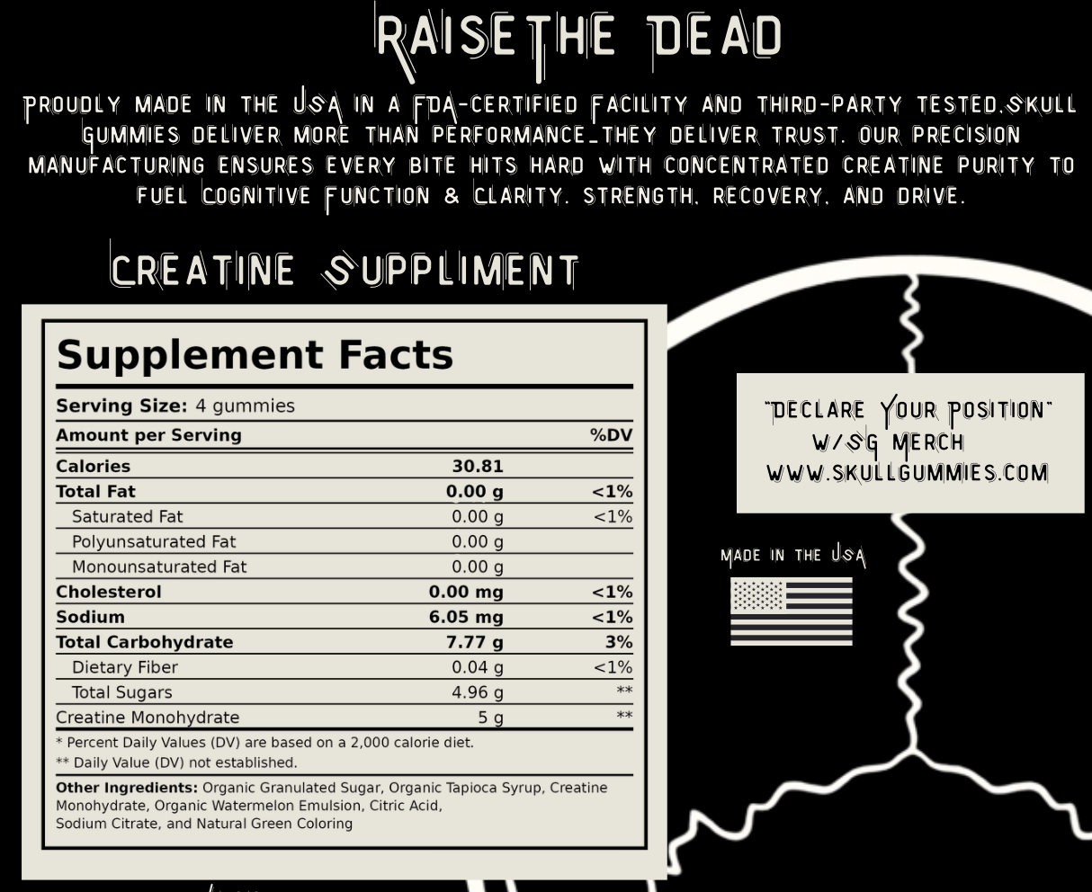Skull Gummies Creatine Gummies deliver 5g of high-grade creatine per serving to support strength, power, and lean muscle growth—without the mess of powders. Formulated with ancient sea salts to help support mineral balance and absorption, and made with organic ingredients and flavorings wherever possible, this is clean, effective performance nutrition you can feel.